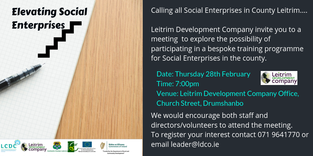 All Social Enterprises in County Leitrim are invited to a meeting to discuss potential bespoke training for the sector. We encourage both staff and directors/ volunteers to attend.